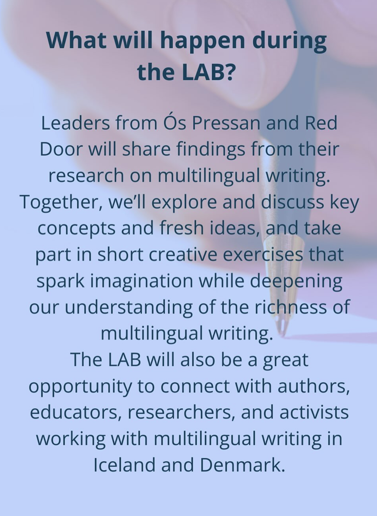 The Multilingual Writing LAB project, developed within the Erasmus+ framework, runs from February 1, 2025, to May 31, 2026. It empowers diverse older youth and adults, supports educators in multicultural settings, and promotes multilingual writing using digital tools. In partnership with Ós Pressan (Iceland) and Red Door (Denmark), the project connects two networks to foster social inclusion through multilingual, multicultural, and multimedia literature.